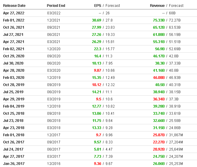 마이크로소프트와 비교하면 Miss가 아예 없는 형태는 아니지만, 2020년 들어서 모두 Beat을 해내고 있다. 그것도 실적 자체가 굉장히 준수하게 Earning Surprise 수준으로 해내고 있다. 최근에 발표된 21.4Q 실적도 어닝서프라이즈를 통해서, 폭락장에서 오히려 폭등을 일으켜내서 지수를 이끄는 모습이 아주 훌륭했다고 생각된다. 앞으로 지수를 잘 이끌고 나가줬으면 좋겠다.